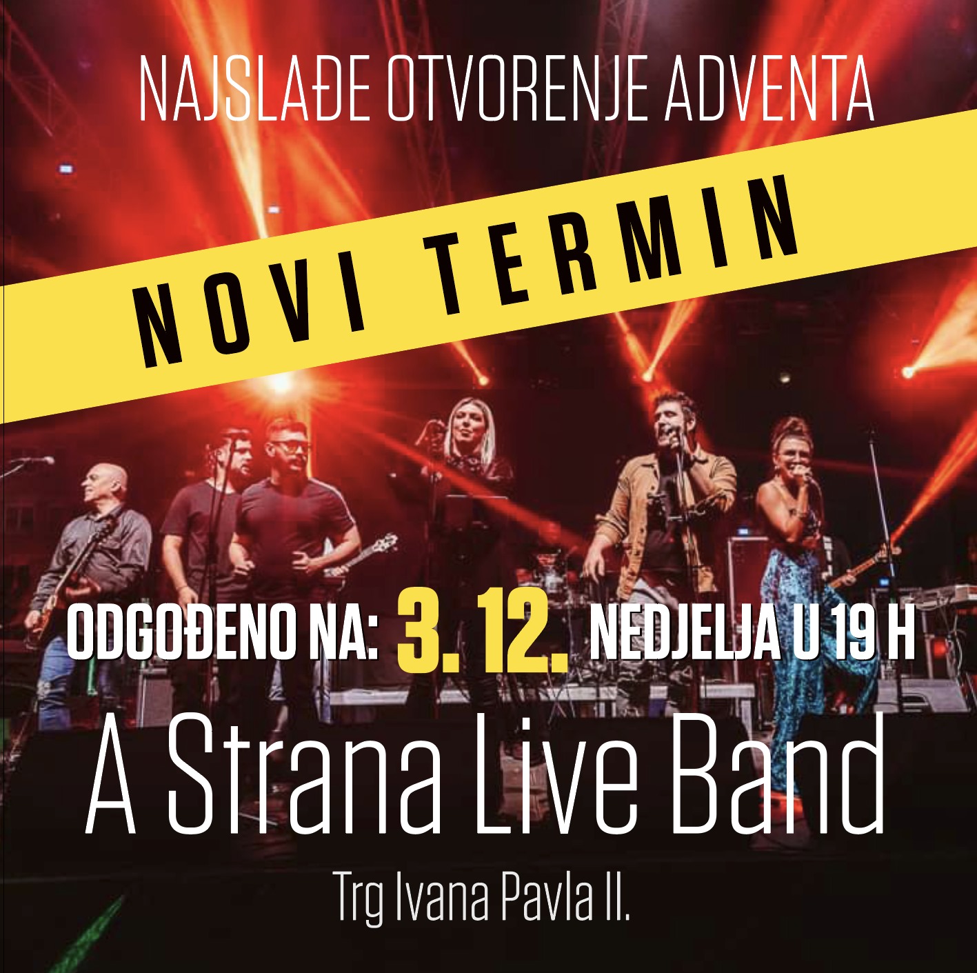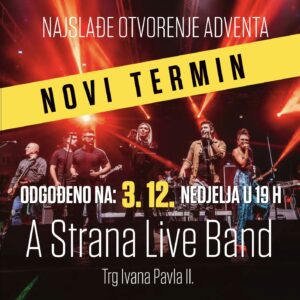 Jaki nanosi vjetra i kiše oštetili su dio naše pozornice te smo primorani tulum otvorenja Najslađeg adventa s A Strana Live Bandom odgoditi na sutra, 3. prosinca u 19 sati.